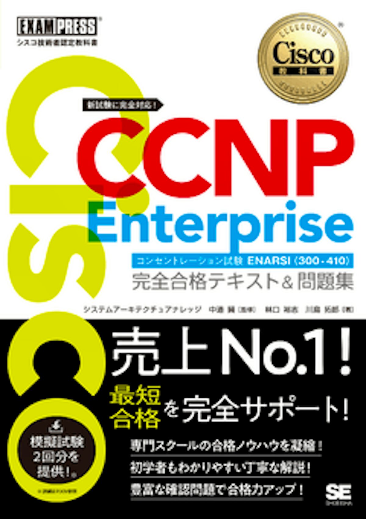おすすめの参考書のひとつとに、「シスコ技術者認定教科書 CCNP Enterprise 完全合格テキスト&問題集」が挙げられます。2020年2月に改定された試験内容にも対応し、テキストと問題集が一体となった参考書です。