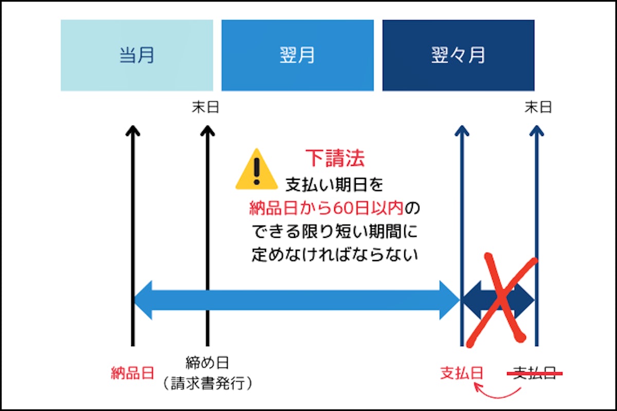 法律(下請法)では、納品日(役務提供日)から60日以内のできる限り短い支払期日を定めています。