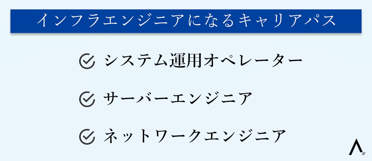 - インフラエンジニアになるには、キャリアの入り口として「システム運用オペレーター」「サーバーエンジニア」「ネットワークエンジニア」がある