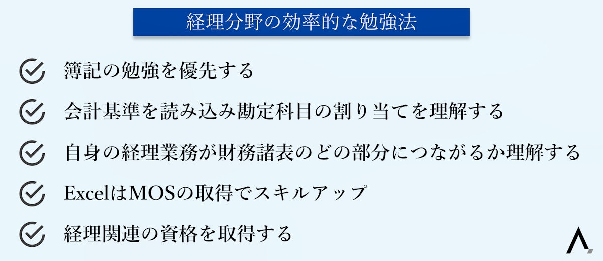 経理分野の効率的な勉強法5つが箇条書きされた図